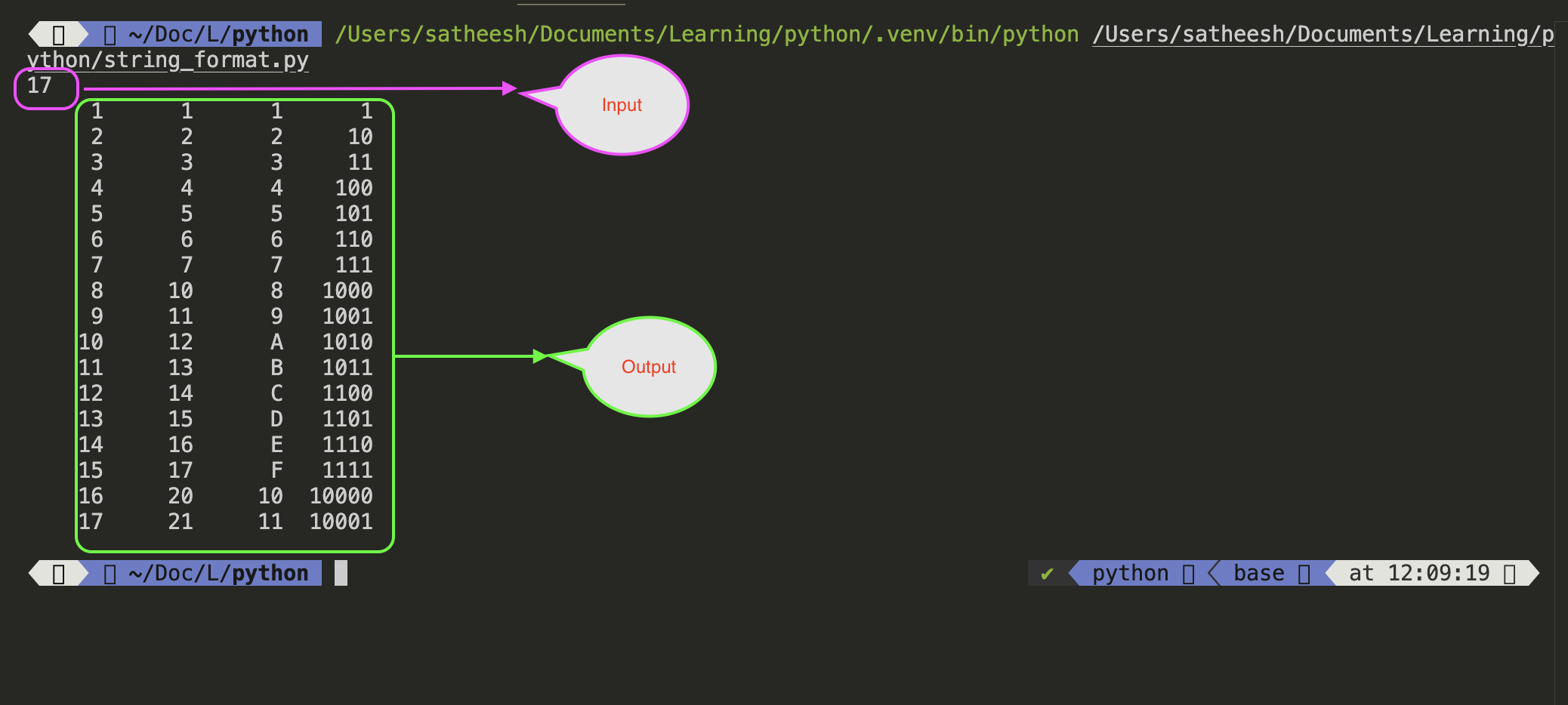 result = f"{num:d}".rjust(width) + " " + f"{num:o}".rjust(width) + " " + f"{num:X}".rjust(width) + " " + f"{num:b}".rjust(width) + " "