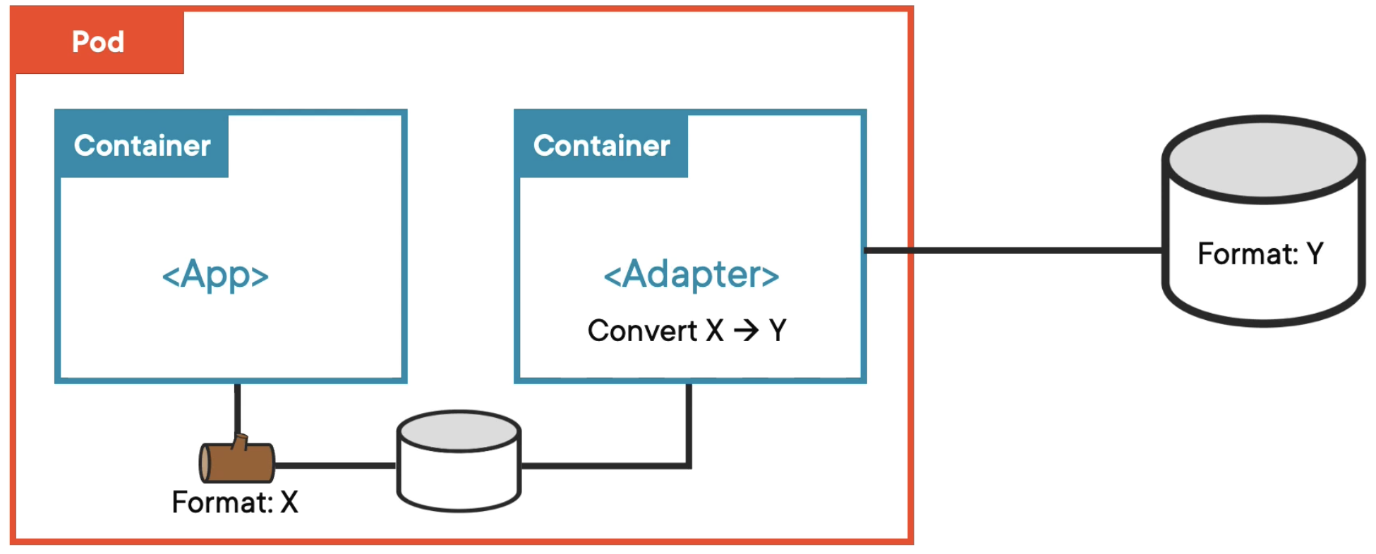 The containers inside in the pod are running alongside together. App container storing the logs in the storage in a specific form. Adapter container reads the logs and converts them to expected form and ships it to a centralized database.